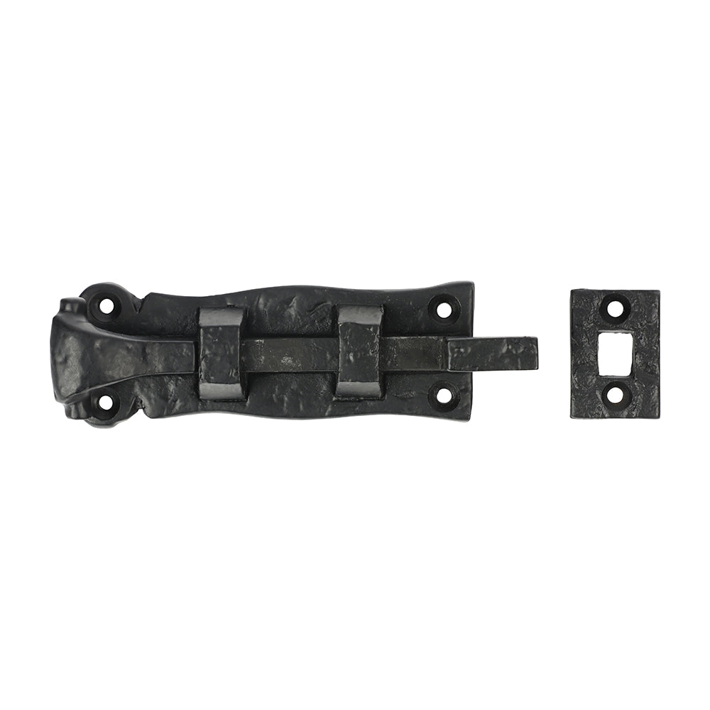 Necked Slide bolt for doors & cupboards, Scroll pattern. Necked bolt for use when the door & frame are not flush. Supplied with matching fixing screws.